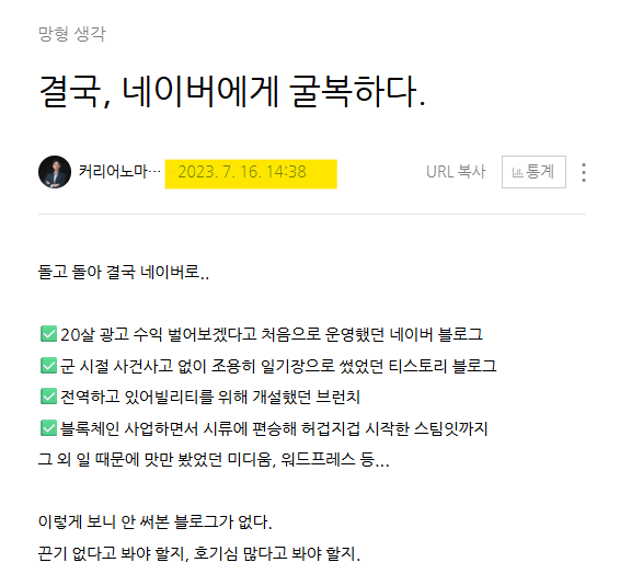 그래서 결국 퇴사한 것도 있었죠. 그리고 퇴사한 그해 여름, 다시 블로그를 켰고, 글을 쓰기 시작했어요. 2023년 7월 16일이었어요.