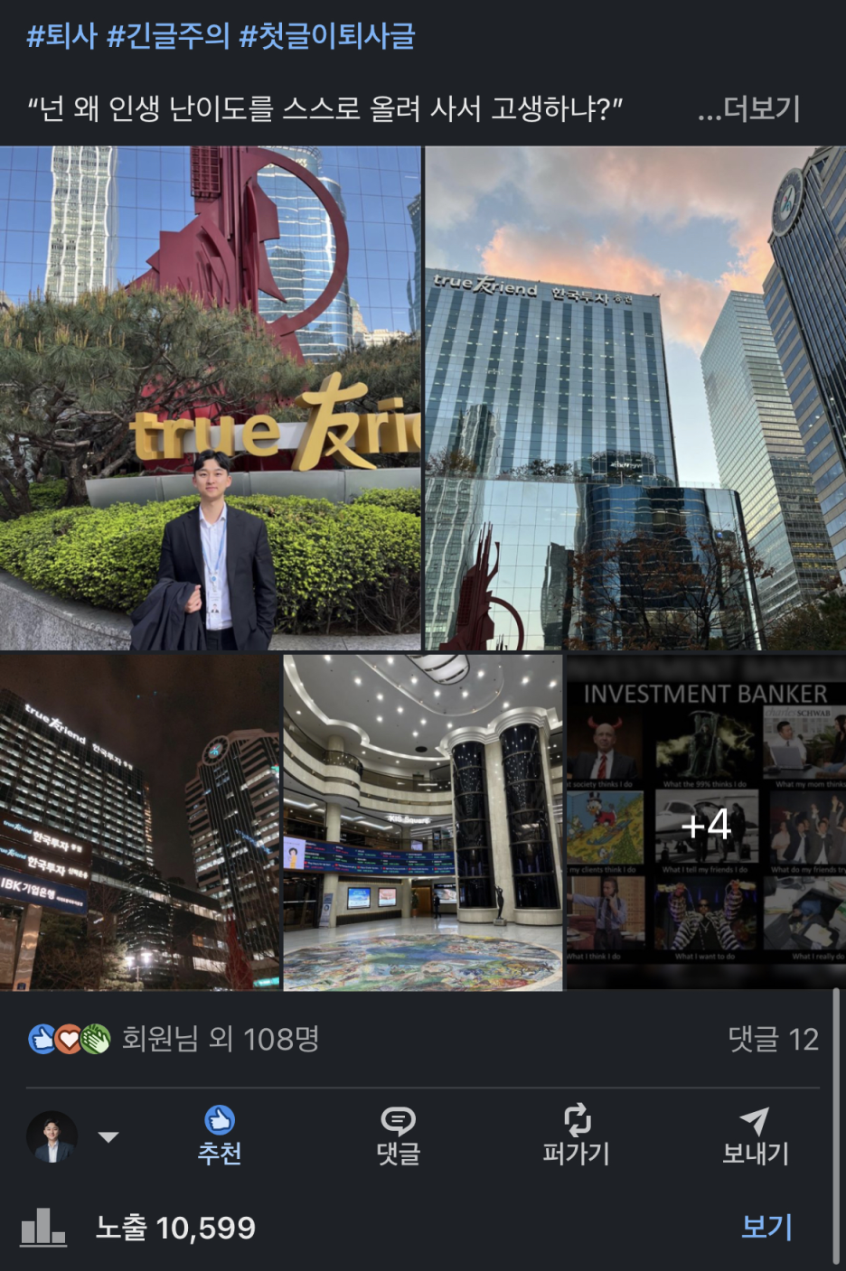 (*) 당시 시장이 좋아서 성과급을 많이 받아 2년차에 억대연봉을 받았고, 그후로는 점차 내리막이었지만, 지금 동기들 얘기 들어보니 많이 회복됐다고 합니다. 첫 부서에서는 사원급 성과급이 얼마 안나오면, 부장님, 팀장님들께서 각출해서 최신형 아이패드 세트를 선물해주시기도 했었습니다 ㅎㅎ.. |