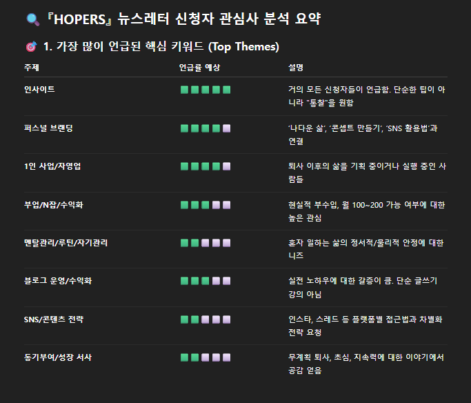 저도 쓸 때에, 각자 원하고 기대하는 주제와 수준, 깊이, 관점 다 다를텐데 어떻게 다 조율할 수 있을까? 고민 많이 했거든요. 챗GPT한테 신청서를 긁어 분석해보라고 했더니 이렇게 결과값을 내어주더라구요.