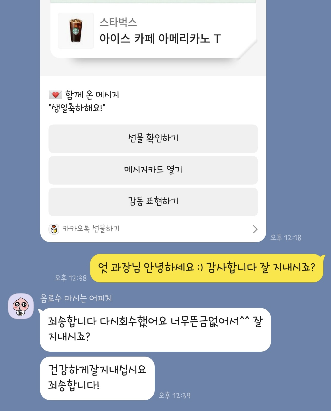 그날 오후, 생일이라고 기프티콘을 보내주셔서 "아, 이런 것도 챙겨주시네" 싶어 좀 놀라고 고마웠죠.