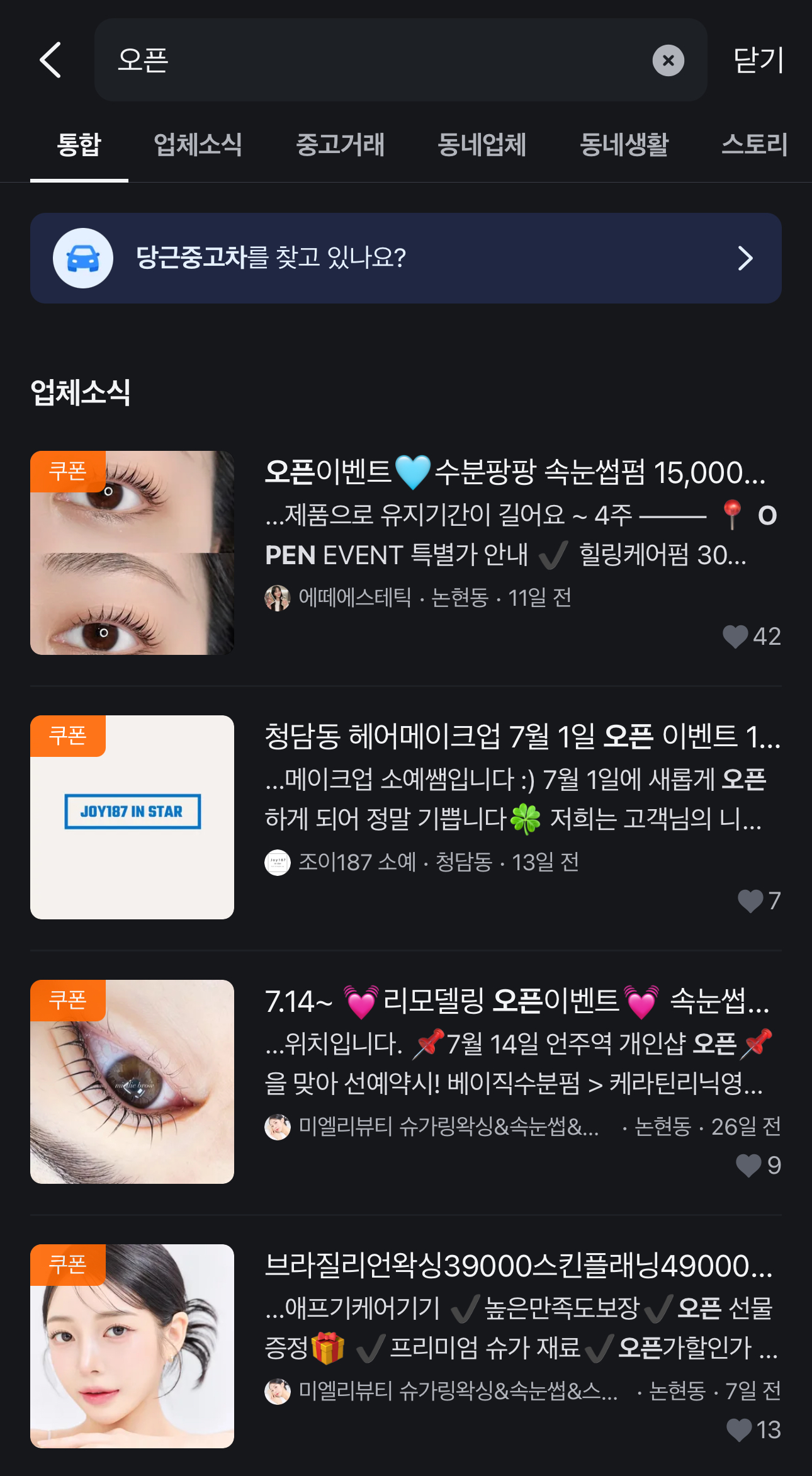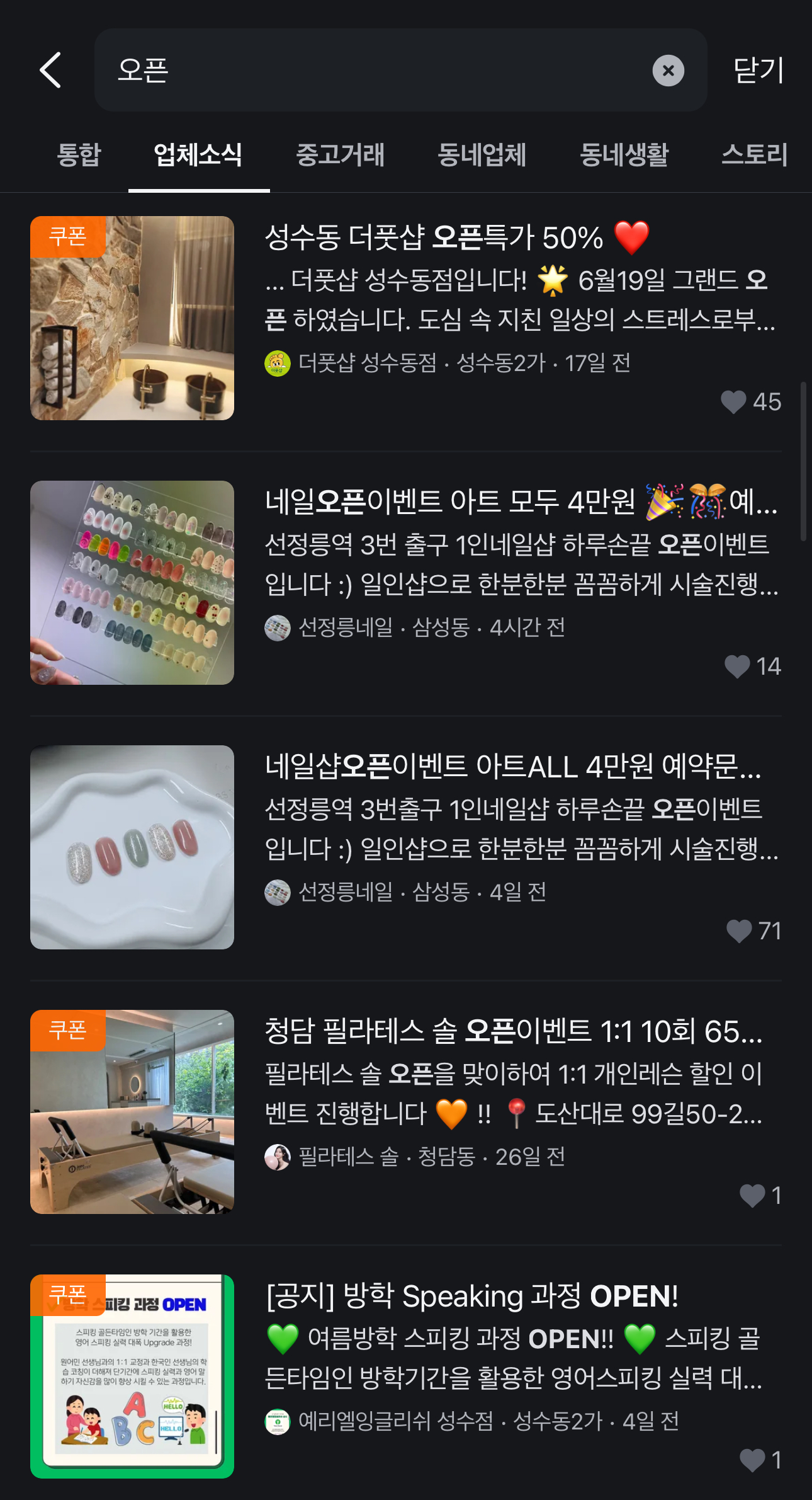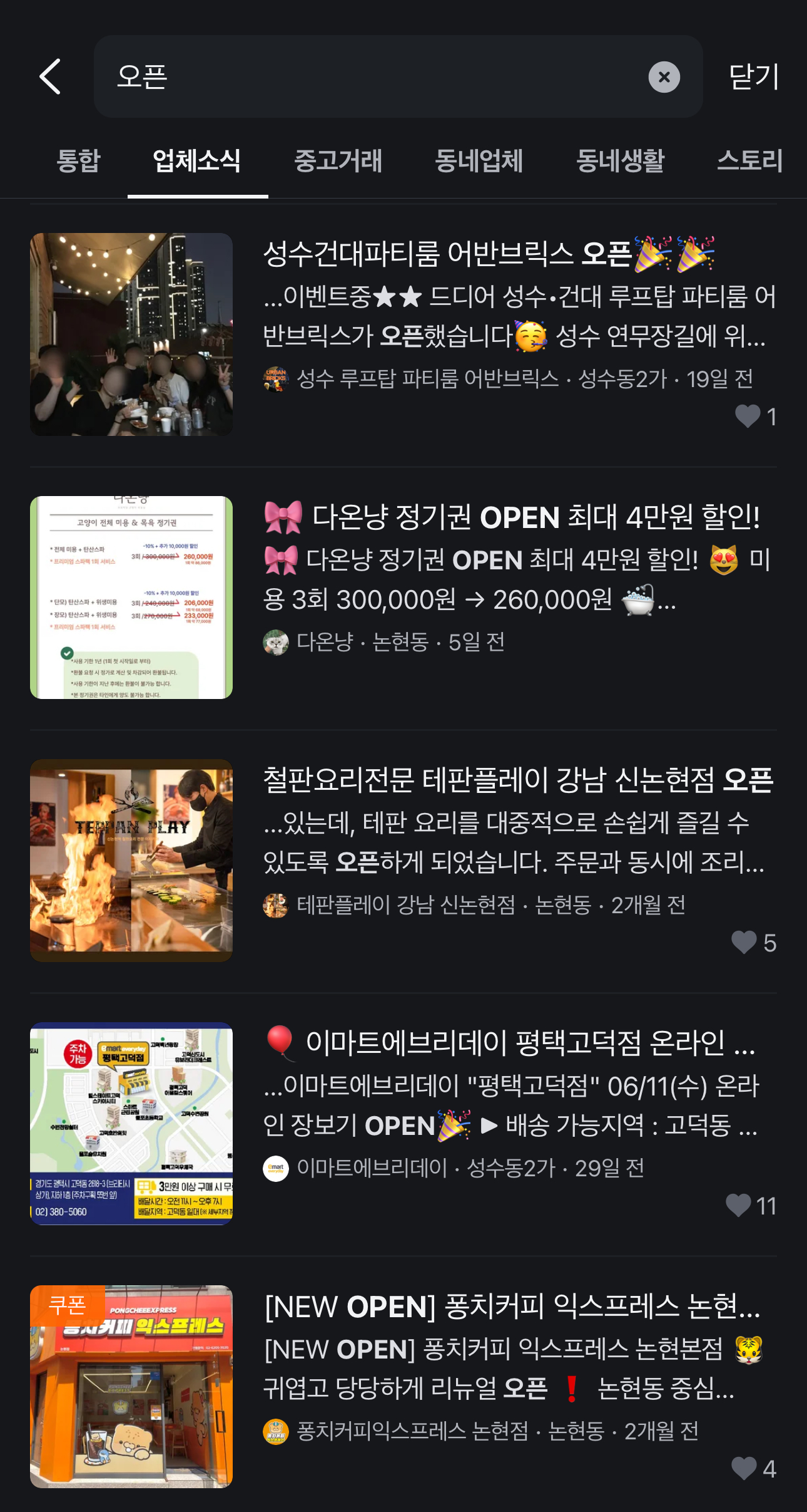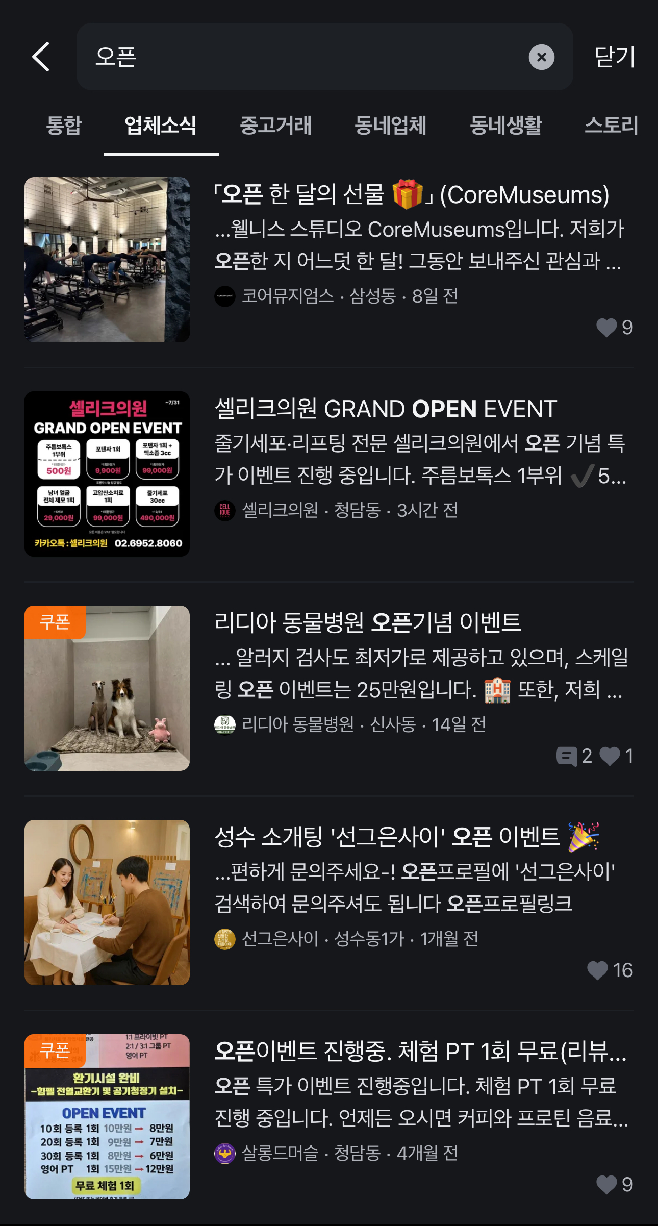 당근에서 [오픈] 검색하시면, 출퇴근이든, 편의점이든, 헬스장이든, 동네 친구들이랑 술 한잔이든, 내가 매일 오가는 거리에 최근 [새로오픈] 한 업장이 셀프 홍보하고 있을 거예요. |
