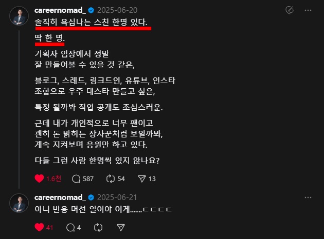 3주 전에 제가 올렸던 글, 혹시 기억하시나요? 그 글도 정확히 말하면, '단 한 명만 타겟으로 쓴 글'이었어요. 조회수 8.7만, 좋아요 1,600개 보다 중요한 건, 그 단 한 명에게 닿았냐, 안 닿았냐겠죠.