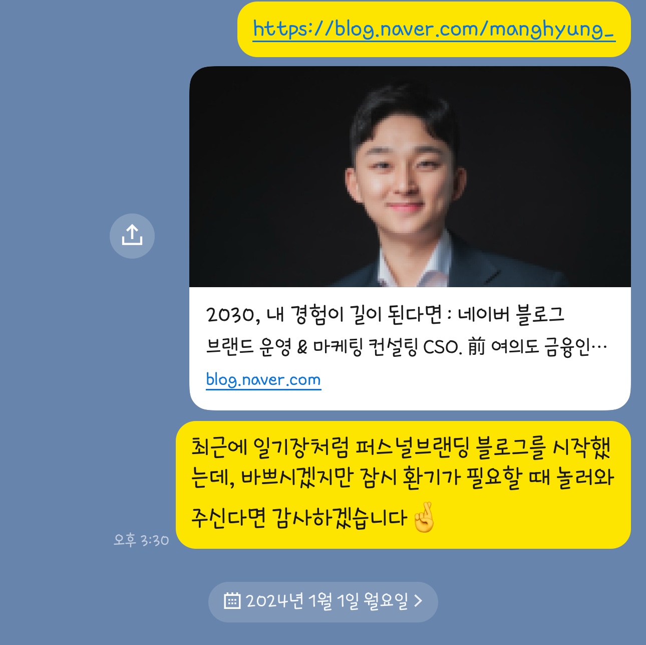 “오늘 일 이야기 너무 재밌었어요. 대표님 인생 얘기에 푹 빠져서 듣다 보니 정작 제 이야기는 제대로 못 드린 것 같아요. 혹시 제가 어떤 관점과 태도로 일하는지 궁금하시다면, 주무시기 전 제 글 한 편만 읽어봐 주세요.”