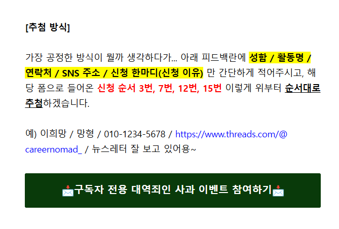 하지만 예상보다 훨씬 많은 분들이 신청해주셔서 솔직히… 조금 울컥하기도 했어요. 신청서 하나하나 읽어보면서 “아, 이 뉴스레터가 진짜 누군가에게 닿고 있구나” 싶었습니다. 진심으로 감사합니다.