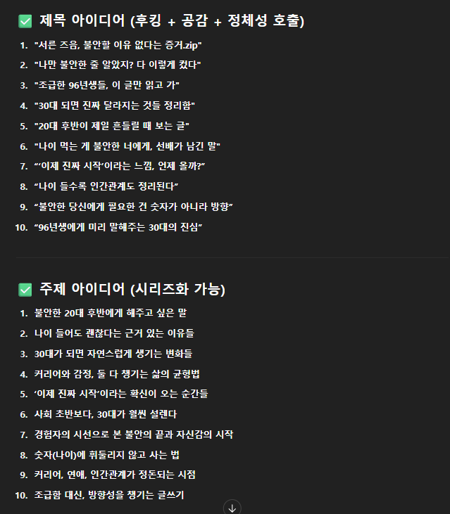 → 챗GPT에 한번 변주를 줘보라고 명령해보세요. 자기에게 맞는 스토리 주제가 나올 것 같네요. |