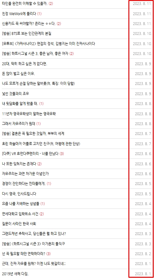 → 일, 직장, 돈, 재테크, 남녀관계, 연애, 결혼, 사회, 이슈 등