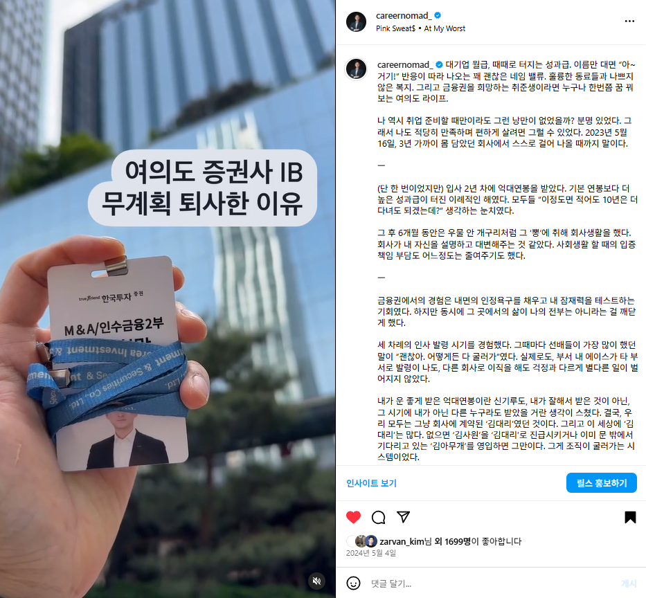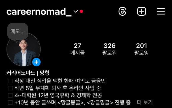 블로그에서 쓰던 세계관을 더 확장해보고 싶어서, 인스타를 시작했어요. 첫 릴스 영상 제목은 "여의도 증권사 IB, 무계획 퇴사한 이유"였는데, 올리자마자 반응이 폭발적이었어요. “아, 이건 진짜 뭔가 있구나” 싶었어요.
