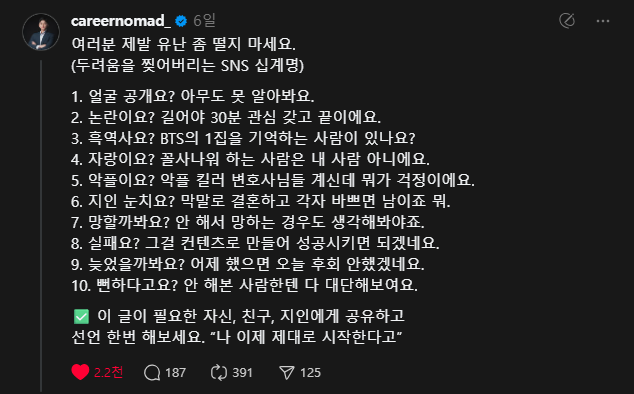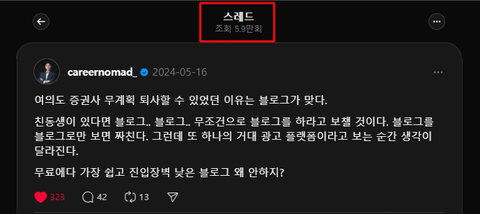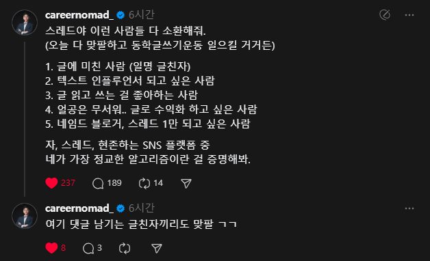 자, 여기서는 저를 한번 믿어보셔야 합니다. 여러분은 이미 특정 분야의 전문가예요. 적어도 '누군가'에게는 분명히 전문가입니다. 그 분야로 기세 좋게, 거침없이 글을 써보세요. “내가 뭐라고…” 하는 생각은 오늘부터 그만입니다. 그건 겸손이 아니라, 자기 가능성에 대한 근거 없는 망상이에요. 스레드는 기세가 90%입니다. 애초에 자신감 없이 쓴 글은 전달력부터 달라요. |