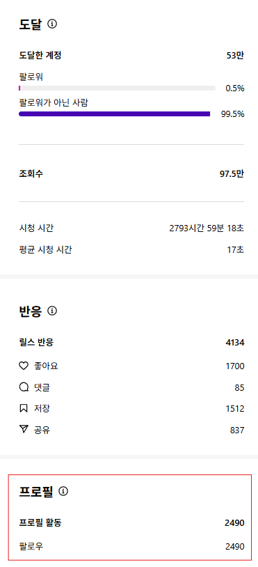 아래 첫 릴스 조회수 97.5만, 팔로워 2,490명 증가. |