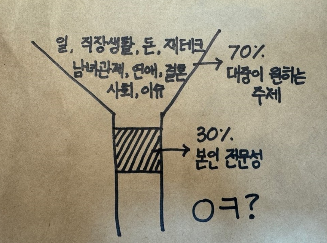 (A) 내가 쓰고 싶은 것만 써서는 안 되고, (B) 남들이 원하는 것만 쓰는 것도 지칩니다. 처음엔 (A)와 (B)를 나눠서 운영해보셔도 좋습니다. 그러다 보면 점차 (A)에 (B)를 자연스럽게 녹이고, (B) 속에 (A)를 슬쩍 묻히는 식으로 더 유연하고 세련된 마케팅이 가능해질 거예요.