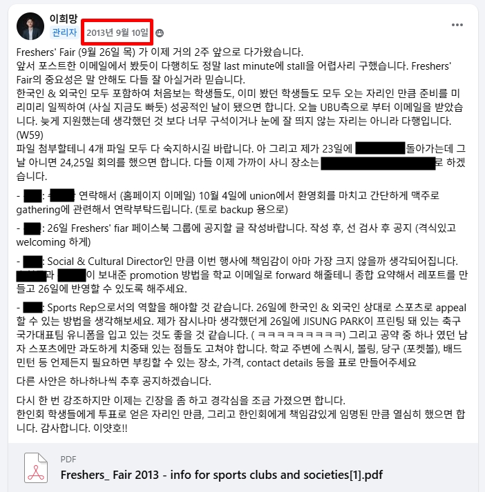 모임이나 네트워킹은… 사실 대학생 때부터 해왔으니까, 벌써 15년째예요. 아래는 대학생 때 한인 학생회 신입생 환영회 관련 이벤트 준비 내용이었던 것 같네요.
