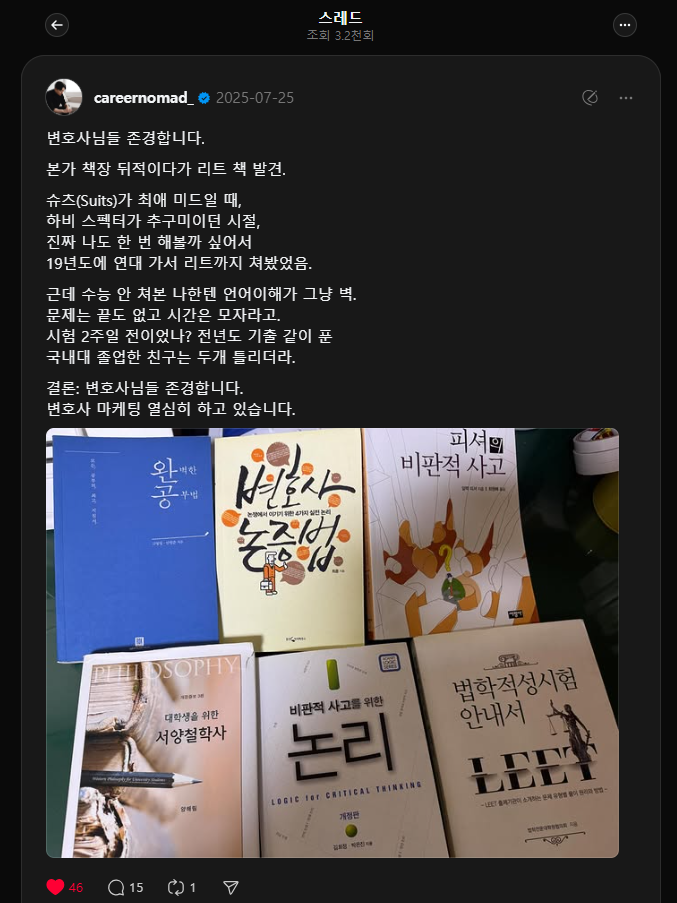 사실 저도 2019년도에 리트까지 쳐본 적이 있을 만큼, 변호사라는 직업에 대한 동경이 있거든요. 실제 변호사님들은 3년차만 넘어가도 우스갯소리로 그런 낭만이 없다고 하시지만, 제 눈에는 여전히 정장 입고 사람 살리는 직업이거든요! ㅎㅎ