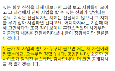 돌아보면, 지금까지 제가 했던 모든 일도 다 그 방향이더라구요. 글을 쓴 건 사람의 마음을 움직이기 위해서였고, 브랜딩을 한 건 사람을 드러내고 연결하기 위해서였고, 사업을 한 건 결국 사람을 모으고 살아가게 하는 일이었으니까요.