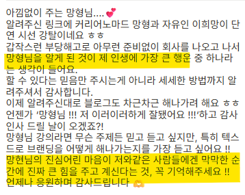 그래서인지 전국 단위 VOD 찍어서 뿌리기보단, 눈앞에서 수강생들의 변화를 직접 보는 게 더 좋더라구요. 사실 모든 수강생이 원하는 결과를 100% 얻진 못했어요 (이건 솔직하게 말씀드립니다).