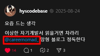 그러다 보니 저도 초심에서 벗어나 노잼으로 빠지고 "아 ㅅㅂ 아무도 모르게 그냥 그만 둘까..." 이런 생각도 잠깐 했었어요" (ㅋㅋㅋ)