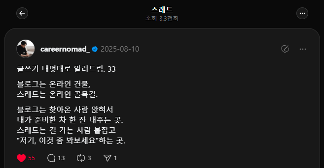 블로그, 스레드, 링크드인, 뉴스레터 같은 텍스트 위주 플랫폼에서 주로 글을 쓰고, 때로는 인스타그램이나 유튜브처럼 비주얼이 중심인 채널에도 발을 담그고 있지만, 결국 제 마음을 가장 붙잡는 건 글쓰기예요.