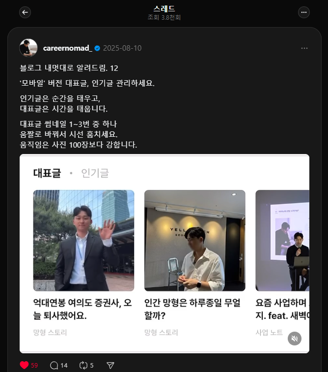 반복은 브랜딩을 만든다고, 같은 패턴으로 같은 주제로 글을 계속 쓰면, 각인 효과가 있거든요. (물론 내용이 좋아야 계속 찾아보고 팔로우 하겠지만요)