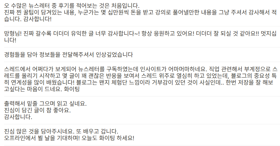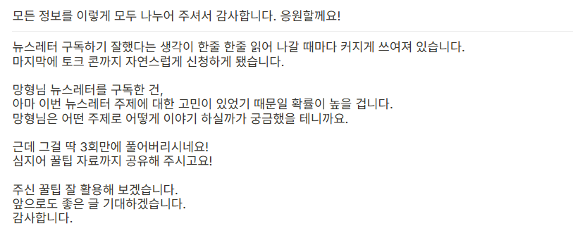 "잘 읽었어요", "더 분발해라" 짧은 피드백도 너무 감사할 것 같아요🥹 한 문단으로 써주시는 구독자분들 너무 감사합니다. |