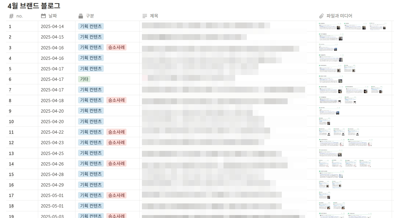 🟩 블로그 하나당 월 15건 포스팅 기준 월 총 225~300건 = 하루 약 10건 작성