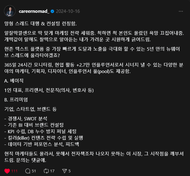 작년 10월 첫 스레드 대행 & 컨설팅 런칭했었는데, 그때는 이렇게 퍼블릭하게 런칭하는 경우가 손에 꼽을 정도였어요.
