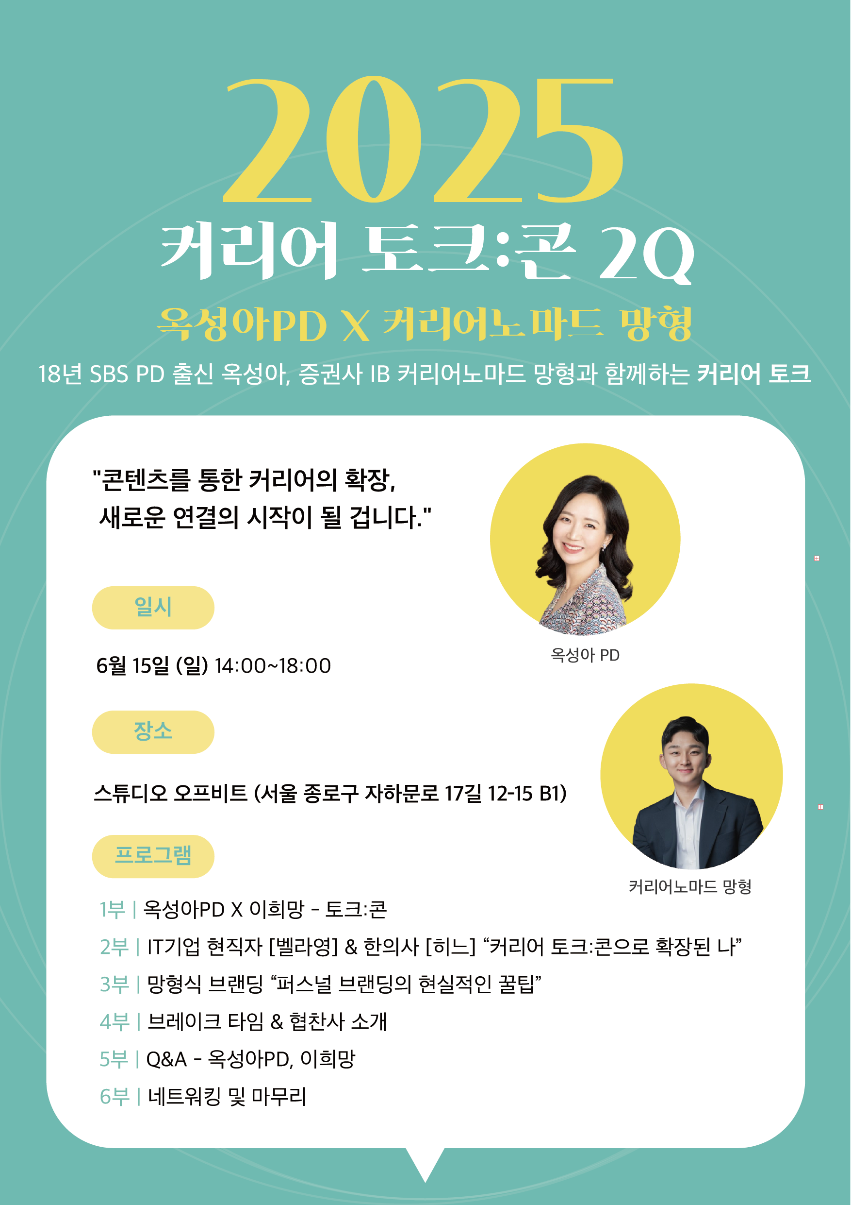 🟩 6/15일 [커리어 토크:콘 그 두번째 이야기]에서 더 깊고 진하게 오프라인에서 풀어보겠습니다. 10일까지 신청 가능 하니 서둘러주세요🫡 (현장에서 질문 많이 해주세요!) |