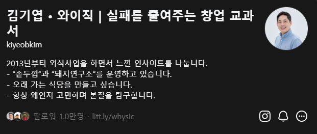 F&B, 투자, 상권, 부동산에 관심이 있으시다면 김기엽 대표님의 계정(아래 참고)을 꼭 팔로우해보시길 추천드립니다. (맛집 추천까지도 아낌없이 해주시는 분입니다.) |