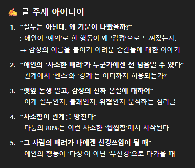 → 챗GPT 명령어: "오늘 남자친구가 내 친구 깻잎을 떼줬는데 질투는 아니었는데 괜히 기분이 나빴다." 내가 이런 감정을 느꼈는데, 이 감정과 상황을 주제로 쓸 만한 글이 뭐가 있을까?