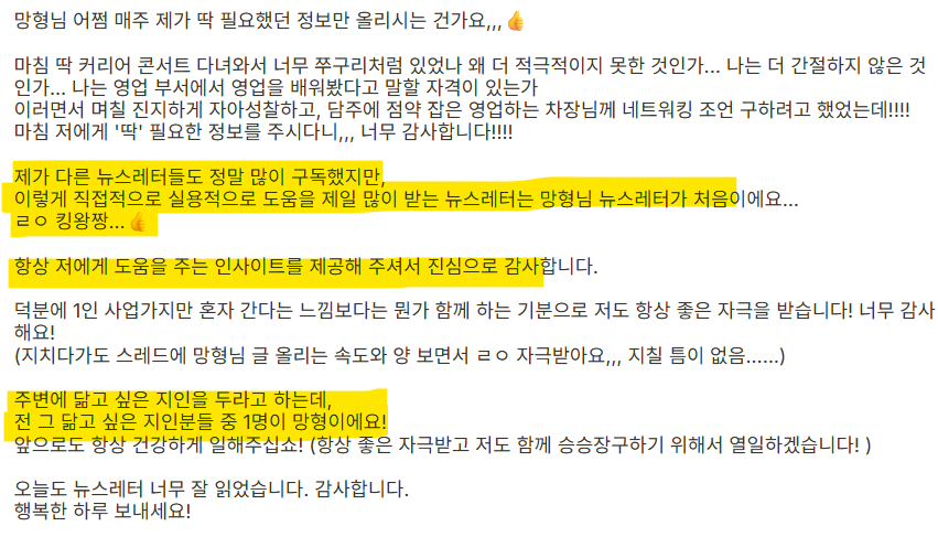 "재밌네요", "잘 읽었어요" 피드백 한줄이 저에게 큰 힘이 됩니다. 매번 장문으로 피드백 써주시는 분들 복 받을 거예요. 감사합니다🫠
