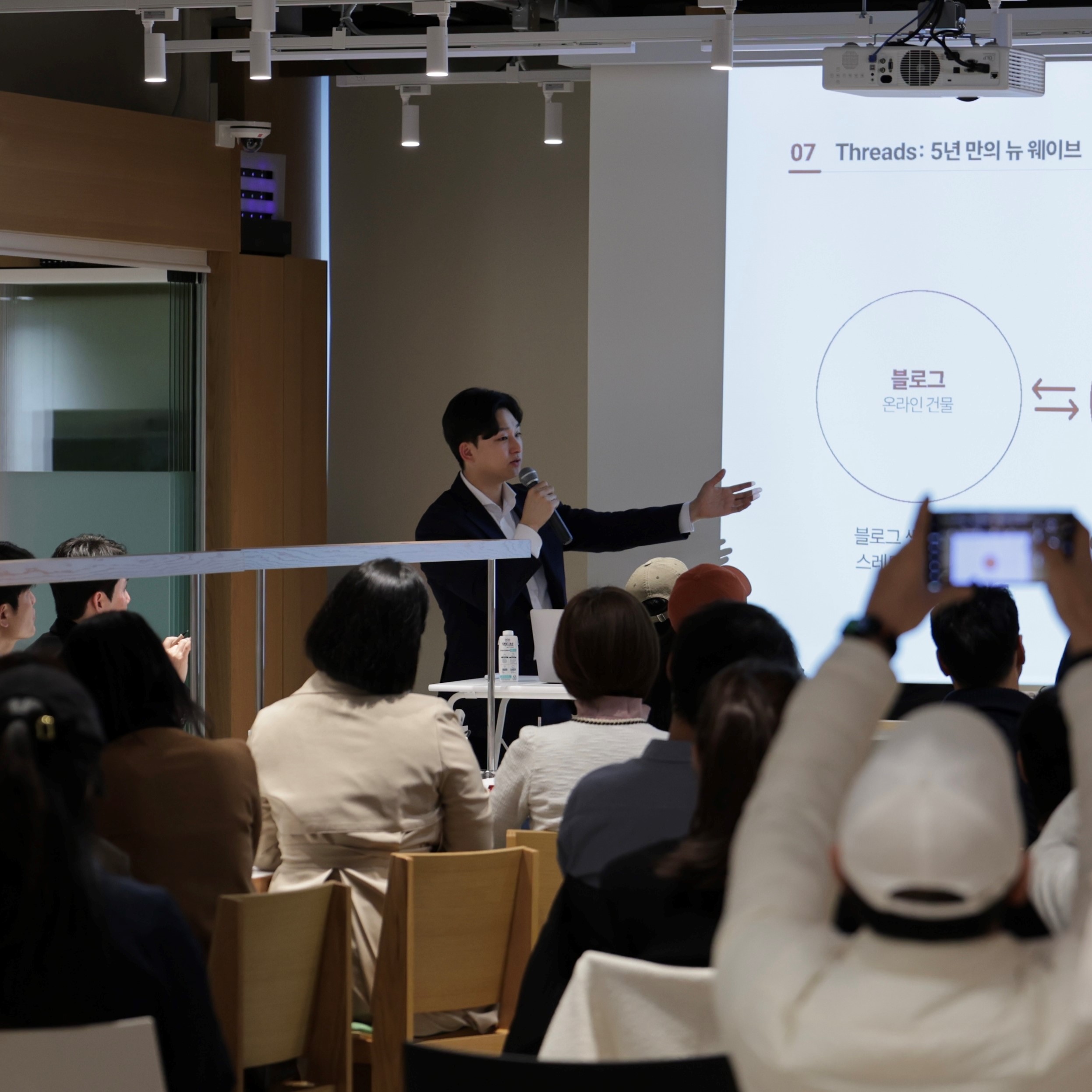 저는 스레드와 블로그로 어떻게 텍스트 인플루언서가 되었는지에 대해, 크리투스님은 AI 시대에 릴스를 어떻게 활용할 수 있을지에 대해, 이승우 변호사님은 SNS 인플루언서와 크리에이터들을 위한 법률 상식을 나눠주셨어요.